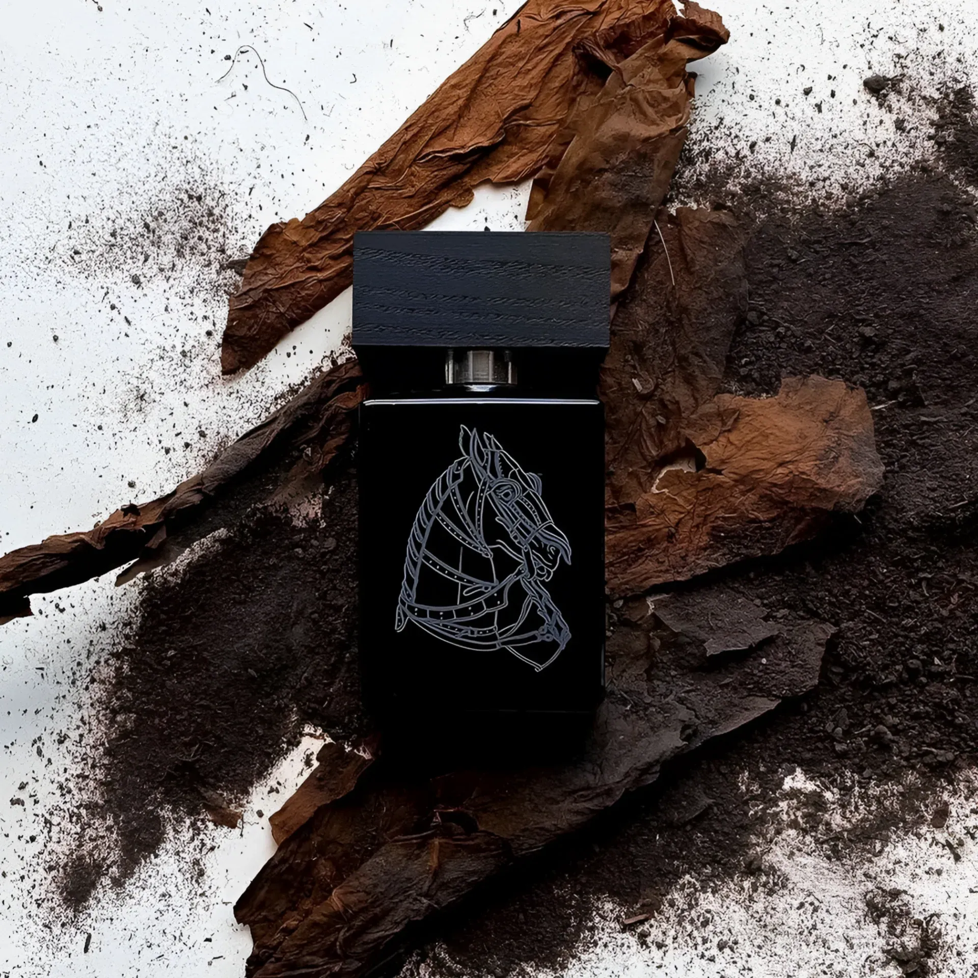 As the scent evolves, the heart reveals its true character: a blend of animalic notes, saddle soap, and leather. The animalic elements give the fragrance a raw, primal edge, while the saddle soap and leather evoke the image of a well-worn saddle from a cavalry horse. The burnt wood adds a smoky, charred quality, further enhancing the fragrance’s rugged, dramatic vibe.